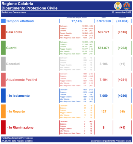 – Cosenza: CASI ATTIVI 2436 (58 in reparto, 0 in terapia intensiva, 2378 in isolamento domiciliare); CASI CHIUSI 172511 (171148 guariti, 1363 deceduti).