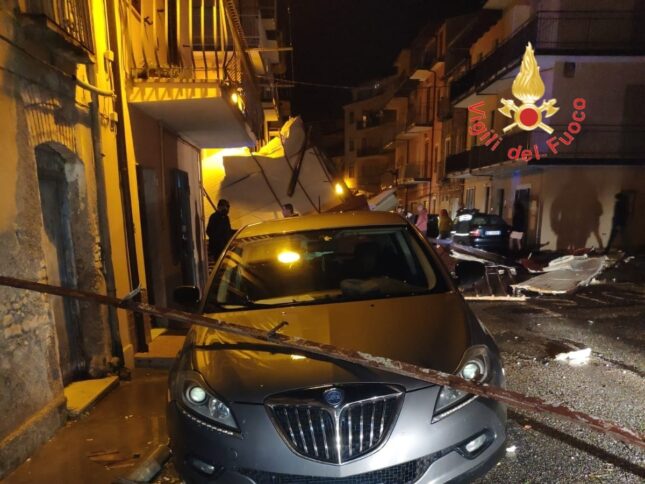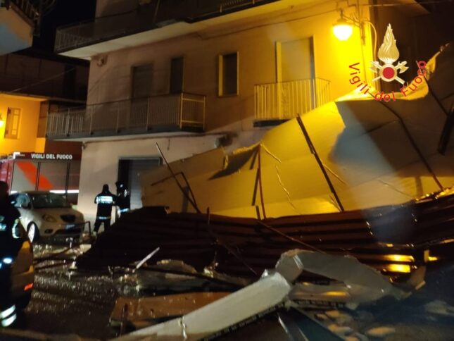 Il violento nubifragio ha colpito il territorio dell’hinterland lametino, dalla costa tirrenica fino al centro storico di Lamezia Terme. Piogge e vento intensi hanno causato allagamenti temporanei delle strade ed enormi disagi alla viabilità ma non solo. In particolare, nel quartiere Sambiase di Lamezia Terme: qui le forti raffiche di vento hanno spezzato i rami di alcuni alberi che si sono abbattuti sulla corsia della via principale, ma hanno anche divelto una tettoia (foto sopra) che, cadendo al suolo, ha danneggiato la facciata di un palazzo e alcune auto sottostanti. Sul posto sono intervenuti prontamente i vigili del fuoco del distaccamento di Lamezia Terme.