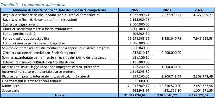 Questi i numeri. «L’ammontare complessivo della manovra di assestamento per l’anno 2022 – scrive la Giunta Occhiuto – vale circa 52 milioni. Tale maggiore disponibilità deriva in parte da maggiori entrate (31,3 milioni) e in quota parte da riduzione di stanziamenti di spesa (-21). La manovra dell’entrata vale 31,3 milioni per iil 2022, 7,9 milioni per il 2023, e 5,1 milioni per il 2024». nel dettaglio la manovra in entrata «è costituita dalla seguenti voci: le maggiori entrate per 13,295 milioni sono relative alla restituzione dell’avanzo libero da parte del Consiglio regionale, le maggiori entrate pari a 491mila euro riguardano le somme versate dal Formez inerenti la quota di partecipazione dei candidati alle procedure concorsuali in atto, le maggiori entrate pari a 7,521 milioni si riferiscono a crediti vantati nei confronti di Sorical Spa. Le maggiori entrate registrate nel triennio 2022-24 rispettivamente per 10, 8,2 e 7,9 milione i derivano dalla reimpostazione di crediti vantati dalla Regione, ma non producono effetti espansivi di spesa perché i relativi importi sono accantonati al fondo credibili di dubbia esigibilità».