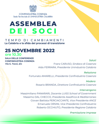 COSENZA “Tempo di cambiamenti. La Calabria e la sfida dei processi di transizione” è il tema scelto da Confindustria Cosenza, sede territoriale di Unindustria Calabria, per l’Assemblea annuale dei soci che si svolgerà, presso la propria sede in Via Tocci a Cosenza, il prossimo venerdì 25 novembre 2022, con inizio dei lavori alle 10:30. «In un momento contrassegnato da tante incertezze – sottolinea il presidente degli industriali cosentini Fortunato Amarelli – è necessario fare il punto su come affrontare in maniera efficace e proattiva i cambiamenti in atto. Riteniamo che la transizione ecologica, in uno con quella digitale, sociale ed economica, avrà un impatto diretto sulle scelte di cambiamento tanto nella pubblica amministrazione che nel sistema dell’imprenditoria privata e nella società in generale. Sarà importante prepararsi in maniera adeguata per riuscire a governare i processi con competenza e senso di responsabilità. Insieme ai rappresentanti delle istituzioni, del mondo della ricerca sociale ed economica e delle imprese, rifletteremo sugli scenari che si stanno delineando, provando ad immaginare ipotesi di governance economica a sostegno della crescita».