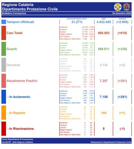 CATANZARO Le persone risultate positive al Coronavirus sono 600.002 (+618) rispetto a ieri. Questi sono i dati giornalieri relativi all’epidemia da Covid-19 comunicati dai Dipartimenti di Prevenzione delle Aziende sanitarie provinciali della Regione Calabria.