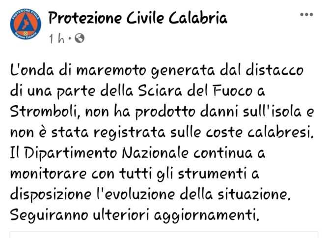 Nel pomeriggio la Prefettura di Reggio Calabria ha informato di «una possibile onda anomala di un metro e mezzo circa che potrebbe raggiungere le coste calabresi a brevissimo». «Tutta la cittadinanza – si legge in una nota – è pregata di non sostare né fermarsi in prossimità di spiagge, arenili e aree limitrofe». L’allarme, secondo quanto si apprende, sarebbe partito dal Dipartimento di protezione civile nazionale che avrebbe allertato la Protezione civile calabrese, ma fortunatamente l’onda non sarebbe arrivata sulle coste calabresi. «È stato verificato con i comuni costieri tirrenici che l’onda non è arrivata sulla costa calabrese», spiega la protezione civile della Calabria. «L’onda di maremoto generata dal distacco di una parte della Sciara del Fuoco a Stromboli, non ha prodotto danni sull’isola e non è stata registrata sulle coste calabresi. Il Dipartimento Nazionale continua a monitorare con tutti gli strumenti a disposizione l’evoluzione della situazione. Seguiranno ulteriori aggiornamenti».