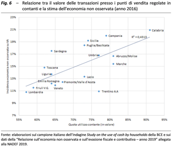 ROMA «Le regioni italiane dove l’utilizzo del contante è più diffuso sono anche quelle in cui si stimano i maggiori livelli di evasione dell’Iva». La relazione dell’Ufficio parlamentare di Bilancio (Upb) è chiara. E il grafico (vedi sotto) pone la Calabria tra le regioni con le peggiori performance assieme alla Campania. Il succo del discorso è semplice, e lo riassume un lancio dell’agenzia Ansa: il contante viaggia spesso di pari passi con l’economia non osservata.