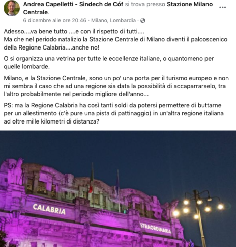 Andrea Capelletti con un post su Facebook lamenta «che nel periodo natalizio la Stazione Centrale diventi il palcoscenico della Regione Calabria»