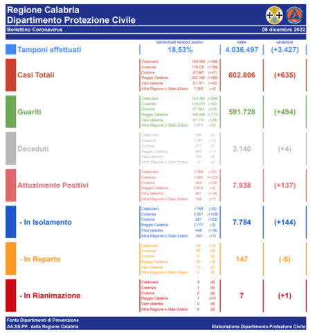 CATANZARO Le persone risultate positive al Coronavirus sono, dall’inizio della pandemia 602.806 (+635 rispetto a ieri). In Calabria, ad oggi, il totale dei tamponi eseguiti è pari a 4.036.497 (+3.427 nelle ultime 24 ore). Questi sono i dati giornalieri relativi all’epidemia da Covid-19 comunicati dai Dipartimenti di Prevenzione delle Asp della Regione Calabria.