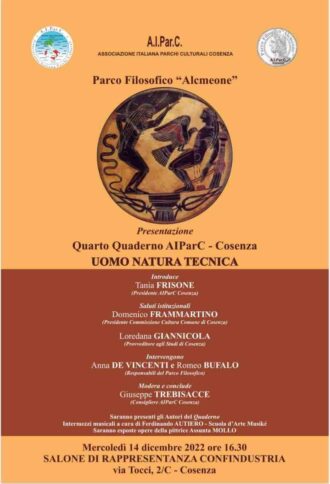 COSENZA Con il Quaderno n.4 dell’Associazione Italiana Parchi Culturali di Cosenza nasce il Parco Filosofico intitolato ad Alcmeone di Crotone. Con esso gli interessi dell’AiParc cosentina si aprono ai problemi più impellenti dell’uomo contemporaneo, che vanno dai cambiamenti ambientali e climatici ai problemi posti dall’imponente sviluppo delle tecniche informatiche e mediali, ai temi della salvaguardia del pianeta.