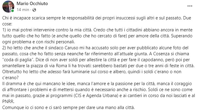 A stretto giro è arrivata la risposta (sempre via social) del senatore di Forza Italia e già primo cittadino di Cosenza, Mario Occhiuto. «Chi è incapace scarica sempre le responsabilità dei propri insuccessi sugli altri e sul passato. Due cose: io mai potrei intervenire contro la mia città. Credo che tutti i cittadini abbiano ancora in mente tutto quello che ho fatto (e anche quello che ho cercato di fare) per amore della città. Superando ogni problema e con rischi personali», sostiene Occhiuto che aggiunge: «ho letto che anche il sindaco Caruso mi ha accusato solo per aver pubblicato alcune foto del passato, cosa che ho fatto senza neanche far riferimento all’attuale giunta. A Cosenza si chiama “coda di paglia”. Dice di non aver soldi per allestire la città e per fare il capodanno, però poi per smantellare la piazza di via Roma li ha trovati: sarebbero bastati per due o tre anni di feste in città». «Oltretutto ho letto che adesso farà luminarie sul corso e albero, quindi i soldi c’erano o non c’erano?», si chiede il sindaco. «Il dramma è che qui mancano le idee, manca l’amore e la passione per la città, manca il coraggio di affrontare i problemi e di mettersi quando è necessario anche a rischio. Soldi ce ne sono come mai in passato, grazie ai programmi (CIS e Agenda Urbana) e ai cantieri in corso da noi lasciati e al Pnrr. Comunque io ci sono e ci sarò sempre per dare una mano alla città», chiosa il sindaco. (f.b.)