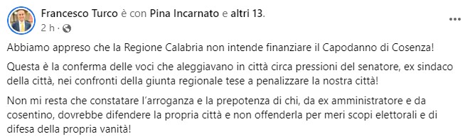 COSENZA A Natale siamo tutti più buoni? Neanche per sogno. A Cosenza lo scontro (verbale) sul mancato finanziamento della Regione Calabria per il Capodanno nella città dei bruzi ha scatenato la veemente reazione del consigliere comunale Francesco Turco. Solitamente tra i più moderati, Turco ha abbandonato l’approccio british lanciandosi in un post veleonso su Facebook con messaggi neanche troppo velati all’indirizzo dell’ex sindaco di Cosenza Mario Occhiuto. «Abbiamo appreso che la Regione Calabria non intende finanziare il Capodanno di Cosenza! Questa è la conferma delle voci che aleggiavano in città circa pressioni del senatore, ex sindaco della città, nei confronti della giunta regionale tese a penalizzare la nostra città!», dice Turco. Che affonda: «Non mi resta che constatare l’arroganza e la prepotenza di chi, da ex amministratore e da cosentino, dovrebbe difendere la propria città e non offenderla per meri scopi elettorali e di difesa della propria vanità!».