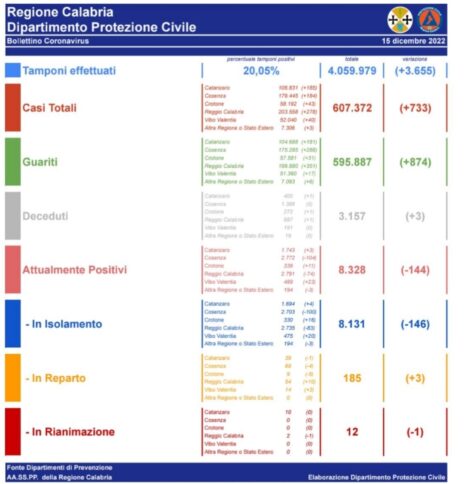 CATANZARO Le persone risultate positive al Coronavirus sono 607372 (+733) rispetto a ieri. Questi sono i dati giornalieri relativi all’epidemia da Covid-19 comunicati dai Dipartimenti di Prevenzione delle AA.SS.PP. della Regione Calabria: In Calabria, ad oggi, il totale dei tamponi eseguiti sono stati 4059979 (+3.655).