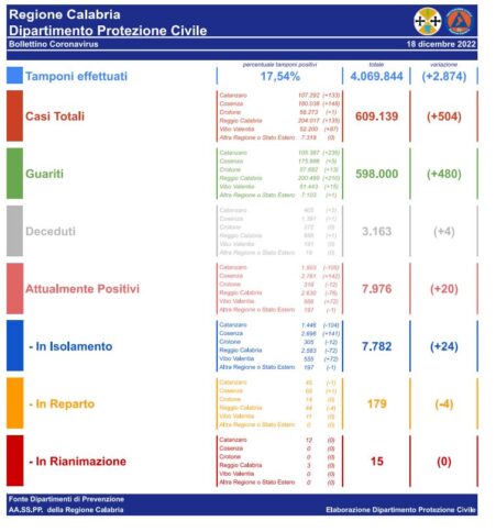 CATANZARO Le persone risultate positive al Coronavirus sono 609139 (+504) rispetto a ieri. Questi sono i dati giornalieri relativi all’epidemia da Covid-19 comunicati dai Dipartimenti di Prevenzione delle Aziende sanitarie provinciali della Regione Calabria.