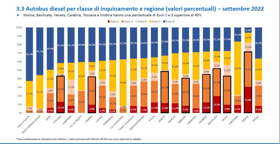 Oltre il 51% dei mezzi in circolazione è altamente inquinante. E nessun bus a zero emissioni. Così la regione resta indietro