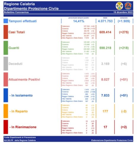CATANZARO Le persone risultate positive al Coronavirus sono 609414 (+275) rispetto a ieri. Questi sono i dati giornalieri relativi all’epidemia da Covid-19 comunicati dai Dipartimenti di Prevenzione delle AA.SS.PP. della Regione Calabria. In Calabria, ad oggi, il totale dei tamponi eseguiti sono stati 4071753 (+1.909).