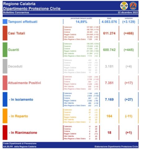 – Vibo Valentia: CASI ATTIVI 509 (14 in reparto, 0 in terapia intensiva, 495 in isolamento domiciliare); CASI CHIUSI 51786 (51594 guariti, 192 deceduti).