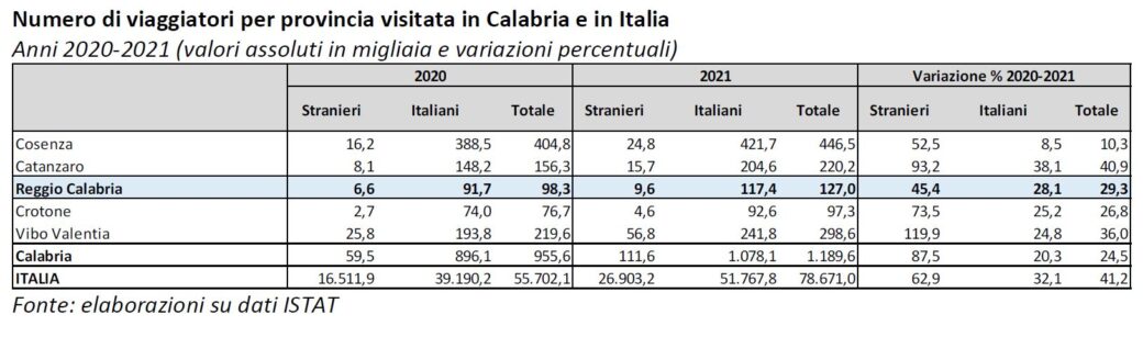 Ed anche il settore turistico registra un trend positivo. L’analisi dei flussi turistici del territorio della Città Metropolitana di Reggio Calabria, si legge nel rapporto che rileva l’eccezionale contrazione del 2020, mostra un netto aumento dei viaggiatori (+29,3% rispetto allo stesso periodo del 2020), trainato dalla componente straniera (+45,4%) rispetto a quella italiana, comunque in aumento (+28,1%). In termini assoluti, i turisti che hanno visitato il territorio reggino nel 2021 sono 127mila: 117mila italiani e circa 10 mila stranieri. Alla crescita del numero dei viaggiatori registrato si associa un incremento del numero di pernottamenti nelle strutture ricettive del territorio, passati dai 258 mila del 2020 ai 316 mila del 2021 (+22,6%), dato in crescita ma ancora al disotto dei livelli del 2019. (redazione@corrierecal.it)