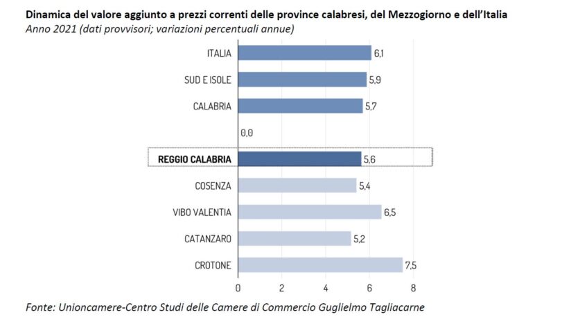 Secondo quanto rappresentato, in particolare il valore aggiunto nella Città Metropolitana di Reggio Calabria è cresciuto in un anno del +5,6%, in linea con il dato regionale (+5,7%), raggiungendo un valore pari a quasi 8,5 miliardi di euro (seconda provincia per incidenza sul totale del V.A. calabrese).