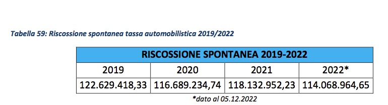 «Il mancato pagamento della tassa automobilistica, quantificato mediamente in 55-60 milioni in ciascuno esercizio finanziario, genera, in media, l’invio di 250.000 accertamenti per ogni anno tributario per un valore approssimato del 33% del dovuto totale (180 milioni)», si specifica nel Defr. «Se si considera, poi, la successiva riscossione coattiva realizzata in seguito all’emissione di accertamenti (riscossione media al 15%) e di cartelle esattoriali (riscossione al 19% delle somme iscritte a ruolo), permane comunque – prosegue il Documento della Regione – una sacca di evasione non recuperata, malgrado tutte le procedure azionate, pari a circa il 22% del dovuto totale». Per la Regione «la situazione è lievemente meno preoccupante per i tributi diversi dalla tassa automobilistica (tassa di concessione regionale, tributo speciale per il deposito in discarica dei rifiuti solidi, addizionale regionale imposta sul gas naturale), perché i soggetti passivi, di numero fortemente inferiore rispetto alla tassa automobilistica e costituiti per lo più da persone giuridiche, risultano proprio in virtù di tali due aspetti, maggiormente aderenti agli obblighi tributari e in ogni caso più facilmente controllabili»