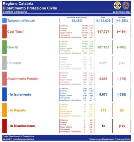 Catanzaro: casi attivi 1142 (43 in reparto, 5 in terapia intensiva, 1094 in isolamento domiciliare); casi chiusi 108342 (107925 guariti, 417 deceduti). Cosenza: casi attivi 3188 (77 in reparto, 0 in terapia intensiva, 3111 in isolamento domiciliare); casi chiusi 179962 (178546 guariti, 1416 deceduti). Crotone: casi attivi 73 (7 in reparto, 0 in terapia intensiva, 66 in isolamento domiciliare); casi chiusi 58683 (58407 guariti, 276 deceduti). Reggio Calabria: casi attivi 1827 (34 in reparto, 5 in terapia intensiva, 1788 in isolamento domiciliare); casi chiusi 204408 (203509 guariti, 899 deceduti). Vibo Valentia: casi attivi 349 (9 in reparto, 0 in terapia intensiva, 340 in isolamento domiciliare); casi chiusi 52309 (52117 guariti, 192 deceduti). Si precisa che, per mero errore materiale di compilazione dei dati, l’incremento dei tamponi effettuati in data 31/12/2022 è stato di 3537 invece di 6671, mentre l’incremento dei contagi in data 01/01/2023 è stato di 616 unità invece di 591.