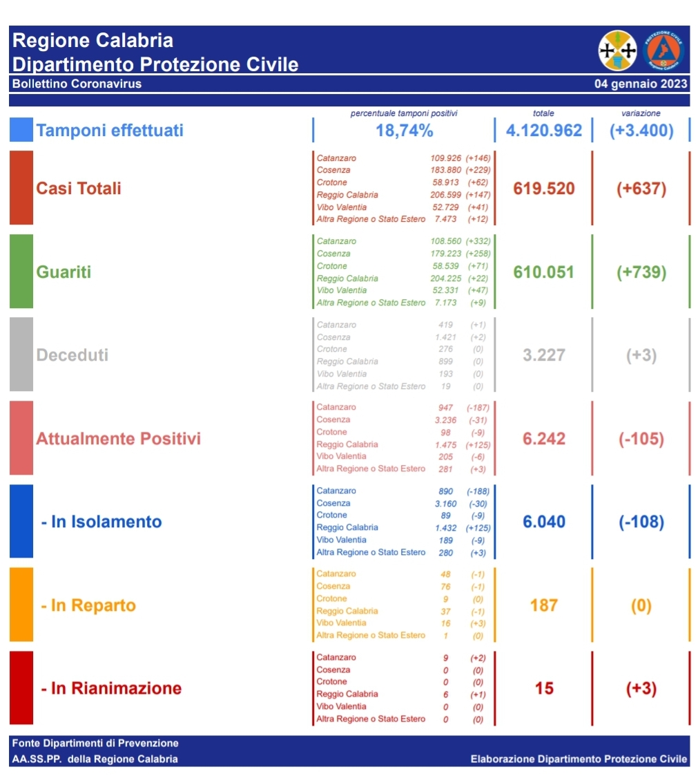 – Catanzaro: CASI ATTIVI 947 (48 in reparto, 9 in terapia intensiva, 890 in isolamento domiciliare); CASI CHIUSI 108979 (108560 guariti, 419 deceduti).