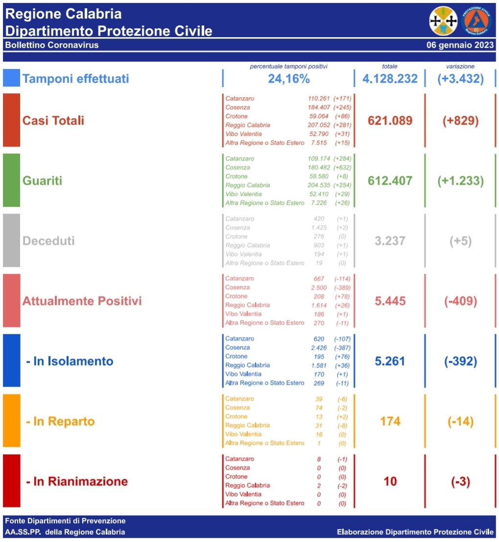 CATANZARO Sono 829 i nuovi casi di Covid registrati nelle ultime 24 ore in Calabria, per un tasso di positività del 24,16%. Il dato emerge dal bollettino della Regione, che nelle ultime 24 ore registra 5 decessi e 1.233 guariti. Diminuiscono i ricoveri in reparto (-14, in totale sono 174) e i ricoveri in terapia intensiva (-3, in totale sono 10).