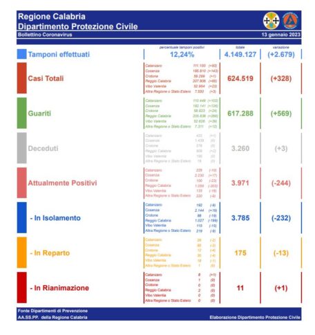 CATANZARO Le persone risultate positive al Coronavirus sono 624519 (+328) rispetto a ieri. Questi sono i dati giornalieri relativi all’epidemia da Covid-19 comunicati dai Dipartimenti di Prevenzione delle Aziende sanitarie provinciali della Regione Calabria.