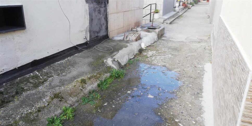 Continua l’elenco dei potenziali pericoli: «Il muro perimetrale lato Sud a ridosso della via Sant’Ilario si presenta in stato di degrado con delle diffuse lesioni, sullo stesso un tubo in pvc scarica acqua che ha mutato il colore della parete interessata dallo scarico in marrone/scuro e accanto si notano delle infiltrazioni di acqua nelle parti lesionate. Nel pozzetto situato all’ingresso secondario (lato monte) del cimitero da molto tempo giungono continuamente acque presumibilmente per uso umano, mentre il rubinetto idrico non funzionante della fontana situato sopra il lavandino al piano superiore del cimitero fino a qualche giorno addietro erogava in modo continuativo acqua, la tubazione alla base era bucata e zampillava acqua che ha formato un laghetto. In questi giorni invece di sostituire il rubinetto idrico e la tubazione bucata si è pensato di eliminare la fontana. La tubazione cementata di scarico della fontana situata sulla destra della seconda scalinata è stata in parte demolita e l’acqua di scarico si riversa sul suolo cementato rendendolo intransitabile. A ridosso e lungo il muro perimetrale ricadente sulla via Sant’Ilario insistono delle cappelle funerarie private alcune delle quali si appoggiano e si sopraelevano di circa tre metri. Il muro di sostegno alto circa 4 metri situato sulla destra del cancello di accesso secondario (lato monte) sul quale successivamente alla sua realizzazione è stato collocato un ulteriore muro di recinzione alto circa 90 cm presenterebbe segni di instabilità e di forte degrado con gran parte di cemento crollato e altra parte pronta a cadere, in particolare la notevole porzione dello spigolo in alto lato monte ove sottostante al muro solitamente posteggiano dei veicoli».