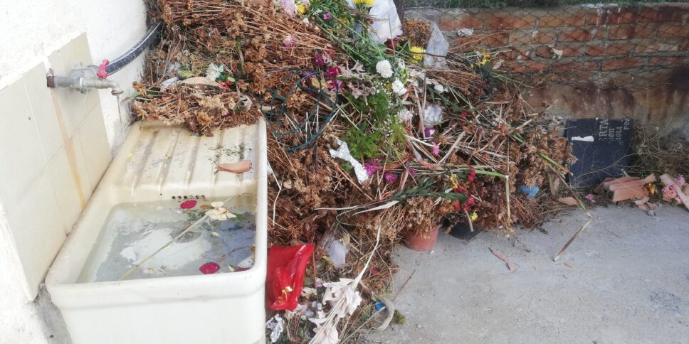 Nella relazione «si legge tra l’altro che i blocchi esistenti presentano, nel lato rivolto verso il terrapieno, delle fessurazioni ad andamento continuo orizzontale, derivanti probabilmente dalla commistione delle azioni di spinta dello stesso terrapieno, che non presenta opere di canalizzazione e regimentazione delle acque, e da cedimenti verificatisi in conseguenza alla cattiva realizzazione delle strutture esistenti, sia in termine di tecnologie utilizzate che di materiali. Lo scorso 28 dicembre 2022 ho riscontrato – continua Crea – che dall’interno di un loculo tra dette fessurazioni esce un tronco di un ramo di albero. In quest’area sono stati smaltiti rifiuti speciali prodotti da demolizione edilizia nonché rifiuti cimiteriali tra cui porzioni di fogli di guaina bituminosa posta sui tetti dei loculi comunali volatizzati dal vento. Altra discarica della stessa tipologia di rifiuti si rinviene in ampliamento dell’area adibita a parcheggio davanti all’accesso principale sovrastante la sottostante via Sant’Ilario sulla quale non si esclude che parte di rifiuti potrebbero scivolare. Il cimitero di Lazzaro ripetiamo è manchevole del servizio di custodia o più corretto dire di “sistema cimiteriale” essendo più di un cimitero: cimitero di Lazzaro, di Motta SG e Serro Valanidi località Ciosso».