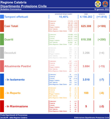 – Reggio Calabria: CASI ATTIVI 797 (29 in reparto, 0 in terapia intensiva, 768 in isolamento domiciliare); CASI CHIUSI 207182 (206271 guariti, 911 deceduti).