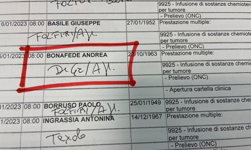 Matteo Messina Denaro si era presentato alla visita con il nome di Andrea Bonafede, nato il 23 ottobre 1963 e stamattina aveva l’appuntamento per il ciclo di chemioterapia. Lo si è appreso in ambienti sanitari della clinica Maddalena di Palermo dove era in cura per un tumore. Nella scheda di accettazione della clinica è scritto “Prestazioni multiple – infusione di sostanze chemioterapiche per tumore”.