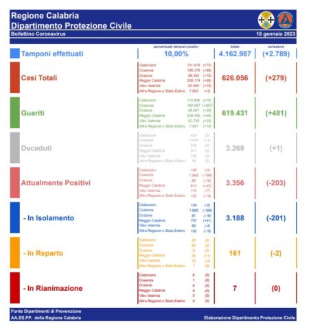 In Calabria, ad oggi – secondo quanto riportano i dati giornalieri relativi all’epidemia da Covid-19 comunicati dai Dipartimenti di prevenzione delle Aziende sanitarie provinciali della Regione – il totale dei tamponi eseguiti è pari a 4.162.987. Le persone risultate positive al Coronavirus sono 626.056. A livello provinciale, la diffusione del Covid è la seguente: Catanzaro: casi attivi 188 (28 in reparto, 6 in terapia intensiva, 154 in isolamento domiciliare); casi chiusi 111230 (110806 guariti, 424 deceduti); Cosenza: casi attivi 1968 (82 in reparto, 1 in terapia intensiva, 1885 in isolamento domiciliare); casi chiusi 184411 (182967 guariti, 1444 deceduti); Crotone: casi attivi 89 (8 in reparto, 0 in terapia intensiva, 81 in isolamento domiciliare); casi chiusi 59373 (59097 guariti, 276 deceduti); Reggio: casi attivi 813 (26 in reparto, 0 in terapia intensiva, 787 in isolamento domiciliare); casi chiusi 207361 (206450 guariti, 911 deceduti); Vibo: casi attivi 115 (16 in reparto, 0 in terapia intensiva, 99 in isolamento domiciliare); casi chiusi 52945 (52750 guariti, 195 deceduti).