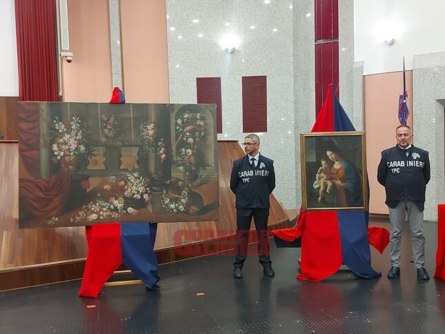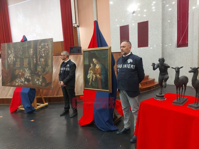 REGGIO CALABRIA «Un risultato operativo eccezionale, importante non solo per la Calabria e l’Italia, ma per l’intera umanità». Così il comandante del Comando carabinieri Tutela patrimonio culturale di Roma, il generale di brigata Vincenzo Molinese, a Reggio Calabria per la restituzione ai legittimi proprietari di sette opere, quattro dipinti ad olio su tela e tre statuette bronzee, trafugate tra il 1979 e il 2017. «Quando si parla di opere d’arte – ha spiegato Molinese – si parla di patrimonio dell’umanità». All’evento, che si è tenuto presso la caserma “Fava e Garofalo”, sede della Scuola allievi carabinieri di Reggio Calabria, questa mattina, erano presenti anche il prefetto Massimo Mariani, il procuratore capo Giovanni Bombardieri, il comandante del Gruppo carabinieri T.P.C. di Roma, il tenente colonnello Andrea Ilari, e il comandante del nucleo carabinieri T.P.C. di Cosenza, il tenente Giacomo Geloso.