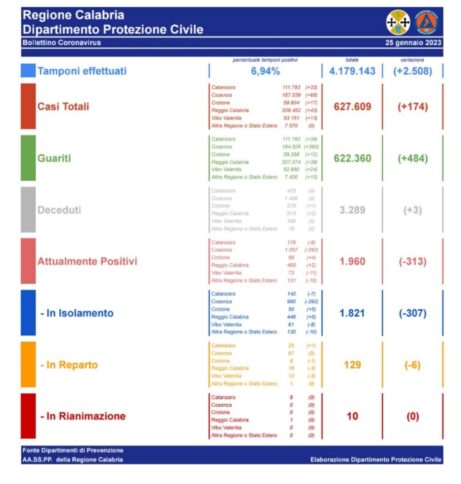 Catanzaro: CASI ATTIVI 176 (25 in reparto, 9 in terapia intensiva, 142 in isolamento domiciliare); CASI CHIUSI 111617 (111192 guariti, 425 deceduti). Cosenza: CASI ATTIVI 1057 (67 in reparto, 0 in terapia intensiva, 990 in isolamento domiciliare); CASI CHIUSI 185982 (184526 guariti, 1456 deceduti). Crotone: CASI ATTIVI 58 (8 in reparto, 0 in terapia intensiva, 50 in isolamento domiciliare); CASI CHIUSI 59546 (59268 guariti, 278 deceduti). Reggio Calabria: CASI ATTIVI 465 (16 in reparto, 1 in terapia intensiva, 448 in isolamento domiciliare); CASI CHIUSI 207987 (207074 guariti, 913 deceduti). Vibo Valentia: CASI ATTIVI 73 (12 in reparto, 0 in terapia intensiva, 61 in isolamento domiciliare); CASI CHIUSI 53078 (52880 guariti, 198 deceduti).