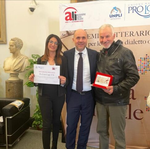 ROMA Il 26 Gennaio 2023 si è svolta a Roma, nella sala della Protomoteca del Campidoglio la cerimonia di premiazione del Premio letterario nazionale per le opere in dialetto o lingua locale “Salva la tua lingua locale”. Un evento giunto alla decima edizione, istituito dall’ Unpli Nazionale (Unione Nazionale Pro loco d’Italia), insieme ad ALI Lazio – Autonomie Locali Italiane, in collaborazione con il Centro Internazionale Eugenio Montale. Tra le diverse sezioni previste, tutte a tema libero, in uno dei dialetti o lingua locale d’Italia, vi era la poesia inedita, e qui che il 3 posto è stato assegnato al Dialetto Laghitano. A meritarsi il podio gli scritti inediti di Antonio Scanga, autore di fama a Lago, che ha accettato l’invito della Pro loco del piccolo Borgo, a partecipare a questo importante appuntamento. «Un premio che rende felice non solo lo stesso autore, e la Pro loco ma tutta la comunità di Lago», sottolinea la Presidente Elvira Sacco, che ha aggiunto, «siamo contenti e onorati di questo riconoscimento, un traguardo importante che ci vede protagonisti come Associazione e soprattutto come cittadini. Il dialetto rientra in quel patrimonio immateriale da tutelare e valorizzare, una mission alla base del nostro operato sul territorio». La Pro loco di Lago, ha ricevuto la menzione speciale per l’impegno profuso nella diffusione e il coinvolgimento di autori per lo stesso Premio.