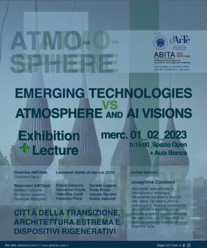 «Il primo evento – è detto – avrà inizio mercoledì 1 febbraio 2023 ore 15.00 con la Mostra_ “Emerging Technologies vs Atmosphere and AI Visions” nello spazio Open_studenti, pt Architettura. Le ricerche di ABITAlab direttrice la prof.ssa Consuelo Nava, e il percorso di tesi dell’ATELIER22, lanciano una sfida al progetto di architettura nelle città della transizione, proponendo immagini personalizzate e prodotte in AI, capaci di esprimere il valore generativo delle tecnologie emergenti, prima di ri-partire con il loro valore formale, in un’espressione rigenerativa di qualità ecologica e digitale che va oltre la prestazione».