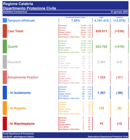 CATANZARO Le persone risultate positive al Coronavirus in Calabria sono, dall’inizio della pandemia, 628.511 (+235 rispetto a ieri). In Calabria, ad oggi, il totale dei tamponi eseguiti è pari a 4.191.415 (+2.979 nelle ultime 24 ore). Questi sono i dati giornalieri relativi all’epidemia da Covid-19 comunicati dai Dipartimenti di Prevenzione delle Asp della Regione Calabria.