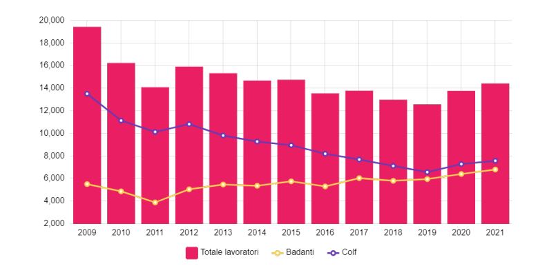 Stando alle proiezioni dell’Inps, il totale dei lavoratori domestici regolarmente impegnati nel 2021 è stato pari a 14.424, in crescita del 1,1% rispetto all’anno precedente. Mentre nel primo semestre del 2022 (ultimo dato censito) il numero di lavoratori in Calabria è pari a 10.831 in diminuzione nel confronto del semestre dal 2021 (-16,6%).