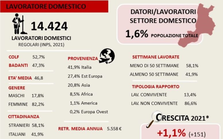 Nel 2021, le famiglie calabresi per garantire la tutela dei propri cari e della casa hanno speso complessivamente 100 milioni di euro finalizzati a pagare gli stipendi, i contributi ed i Tfr dei lavoratori domestici. Anche se la media annuale della retribuzione di quanti operano tra le mura domestiche dei calabresi, resta decisamente bassa: 5.558 euro l’anno.