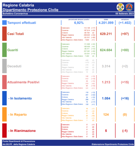 CATANZARO Le persone risultate positive al Coronavirus sono, dall’inizio della pandemia, 629.211 (+97 rispetto a ieri). In Calabria, ad oggi, il totale dei tamponi eseguiti è pari a 4.201.099 (+1.402). Questi sono i dati giornalieri relativi all’epidemia da Covid-19 comunicati dai Dipartimenti di Prevenzione delle Asp della Regione Calabria.