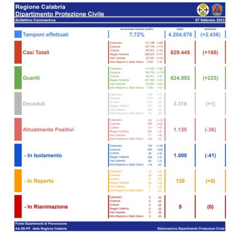 CATANZARO Le persone risultate positive al Coronavirus sono 629445 (+188) rispetto a ieri. Questi sono i dati giornalieri relativi all’epidemia da Covid-19 comunicati dai Dipartimenti di Prevenzione delle Aziende sanitarie provinciali della Regione Calabria.