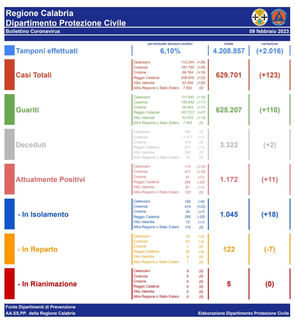 CATANZARO Sono 123 i nuovi casi di Covid registrati nelle ultime 24 ore in Calabria, per un tasso di positività del 6,10%. Il dato emerge dal bollettino della Regione, che nelle ultime 24 ore registra 2 decessi e 110 guariti. Diminuiscono i ricoveri in reparto (-7, in totale sono 122), mentre resta stabile il numero dei ricoveri in terapia intensiva (in totale sono 5).