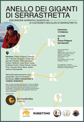 SERRASTRETTA L’anello dei giganti di Serrastretta è il nome dell’escursione guidata e narrata, organizzata dal gruppo escursionistico Serrastretta Trekking nell’ambito del Festival delle Erranze e della Filoxenia che si terrà domenica 12 febbraio nella cittadina del Reventino, nota soprattutto per l’artigianato del legno e le caratteristiche sedie: un cammino tra i luoghi della natura e i percorsi della memoria guidato dallo scrittore Francesco Bevilacqua. L’appuntamento è per le ore 9 in Piazza Pitagora a Serrastretta per tutti i camminatori appassionati e desiderosi di intraprendere una coinvolgente passeggiata tra i monumentali boschi di castagni che circondano l’abitato del piccolo centro montano. L’iniziativa è realizzata in collaborazione con Rubbettino Editore e, per la prima volta insieme, con altre tre meritorie associazioni: Conflenti Trekking, nota per l’impegno profuso nella riscoperta dell’area del Reventino-Mancuso, Escursionisti Appennino Paolano, da anni impegnata nell’esplorazione della Catena Costiera e realizzatrice del Cammino di San Francesco di Paola, Kalabria Trekking, che ha a sua volta realizzato il Cammino Coast to Coast ed è stata fra le promotrici della vincente battaglia per salvare dalle pale eoliche Monte Coppari. Con un percorso di quasi 15 km, per un tempo di percorrenza di circa 6 ore su un dislivello di 250 m. – dagli 840 msl. di Piazza Pitagora, punto di partenza, fino ai 1050 msl. di Monte Condrò – (obbligatoria attrezzatura da trekking adeguata al meteo di questi giorni ed acqua e colazione a sacco a cura dei singoli partecipanti), verranno ripercorse le antiche vie di comunicazione e di economia che hanno scandito la vita dei nostri avi. In questi luoghi infatti venivano conclusi importanti scambi commerciali, basati per lo più sulla lavorazione delle castagne e del legname, e s’intessevano le relazioni sociali che stavano alla base dell’operosa comunità serrastrettese e non solo. Durante tutto il tragitto si incontreranno straordinari castagneti da frutto ancora utilizzati per la produzione delle castagne ed anche decine di monumentali castagni alcuni dei quali di oltre sei metri di circonferenza, miracolosamente sopravvissuti ai tagli e che devono essere assolutamente salvati. Lungo il percorso anche antiche castagnare (casette di pietra per l’essiccazione delle castagne), edicole votive che sin da epoca pre-cristiana erano sacre a Ermes, dio greco dei viaggiatori, e per questo poste ai crocicchi ed ai guadi (poi trasformate in luoghi di culto cristiani), rupi ammantate di storie leggendarie, piccole gole fluviali, splendide vedute sulla Conca di Decollatura e sulla Sila. Durante il cammino, lo stesso Francesco Bevilacqua terrà una conversazione sugli “Alberi monumentali in Calabria”, tratta dal libro omonimo edito da poco per Rubbettino. L’evento si inserisce nel calendario invernale del Festival delle Erranze e della Filoxenia, volto appunto al recupero di antiche storie, luoghi e testimonianze nonché al rispetto e alla difesa della natura e della cultura dell’area del Reventino-Mancuso. Per informazioni sull’evento e contatti, è possibile visitare la pagina Facebook di SerrastrettaTrekking.