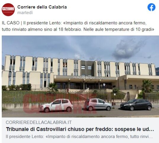 Temperature sotto zero. Al Tribunale di Castrovillari tutto sospeso causa freddo. Gli impianti di riscaldamento e i condizionatori non funzionano da tre anni. Hanno provato ad accendere stufe negli uffici ma l’impianto elettrico non regge. Nel 2022 c’è stata una manifestazione per sollevare il problema. I tecnici intervenuti hanno appurato che il problema dipende dall’usura di un pezzo guasto da anni. Ne è stato disposto l’acquisto, ma il fornitore si è rivolto in Cina e dovrebbe arrivare tra 15 giorni. Voto “due” a chi non riesce a garantire la normale amministrazione della Giustizia.