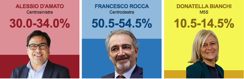 In base all’Exit Poll del Consorzio Opinio Italia per la Rai, alle regionali per il Lazio Francesco Rocca, candidato del centrodestra, raggiunge una forchetta tra il 50,5% e il 54,5% seguito da Alessio D’Amato, candidato del centrosinistra, il quale si piazza invece con una forchetta tra il 30% e il 34%; terza la candidata M5S Donatella Bianchi la quale raggiunge una forchetta tra il 10,5% e il 14,5%.