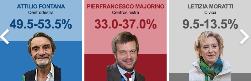 Per le Regionali in Lombardia, in base all’Exit poll del Consorzio Opinio Italia per la Rai, Attilio Fontana, presidente uscente e candidato del centrodestra raggiunge una forchetta tra il 49,5% e il 53,5% seguito da Pierfrancesco Majorino (centrosinistra-M5s) che raggiunge una forchetta tra 33% e il 37%. Più staccata Letizia Moratti (Terzo polo) tra il 9,5% e il 13,5%. Ultima Mara Ghidorzi (Unione popolare) tra l’1 e il 3%.