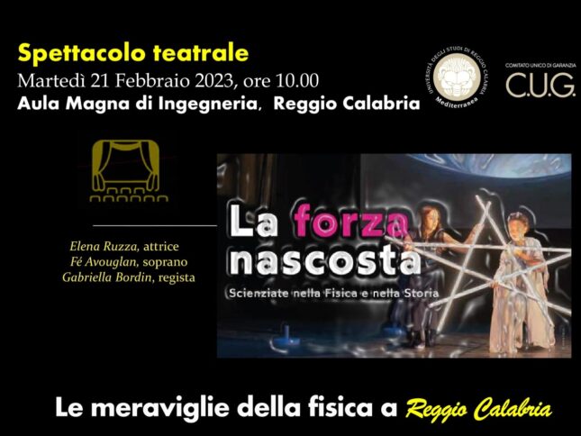 REGGIO CALABRIA «L’11 febbraio si è celebrato in tutto il mondo la “Giornata internazionale delle donne e delle ragazze nella scienza”, istituita dalle Nazioni Unite con l’obiettivo di puntare i riflettori sul tema “donne e scienza” per promuovere una maggiore partecipazione delle ragazze alla formazione e alle professioni scientifiche». Lo riporta una nota dell’Ateneo reggino che aggiunge: «In occasione di questa ricorrenza, martedì 21 Febbraio alle ore 10.00 presso l’Aula Magna di Ingegneria dell’Università Mediterranea di Reggio Calabria si terrà lo spettacolo teatrale “La Forza Nascosta. Scienziate nella Fisica e nella Storia”. E’ la prima volta che va in scena nel Sud Italia!».