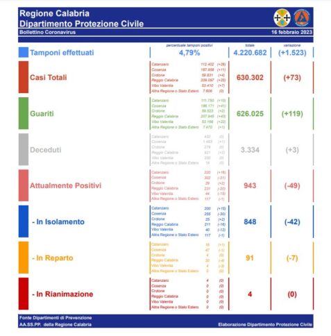 CATANZARO Sono 73, ieri erano 97, i contagi riscontrati nelle ultime 24 ore in Calabria a fronte di 1.523 tamponi processati. Il tasso di positività rimane pressoché stabile al 4,79%. Tre i nuovi decessi registrati che portano il totale delle vittime a 3.334. Meno 7 i ricoverati nei reparti ordinari degli ospedali della regione, stabili invece per terapie intensive (4). I guariti sono 626.025 (+119), gli attualmente positivi 943 (-49) e gli isolati a domicilio 848 (-42). Ad oggi – riportano i dati giornalieri relativi all’epidemia da Covid-19 comunicati dai Dipartimenti di Prevenzione delle Aziende sanitarie provinciali della Regione – le persone risultate positive al Coronavirus sono 630.302.