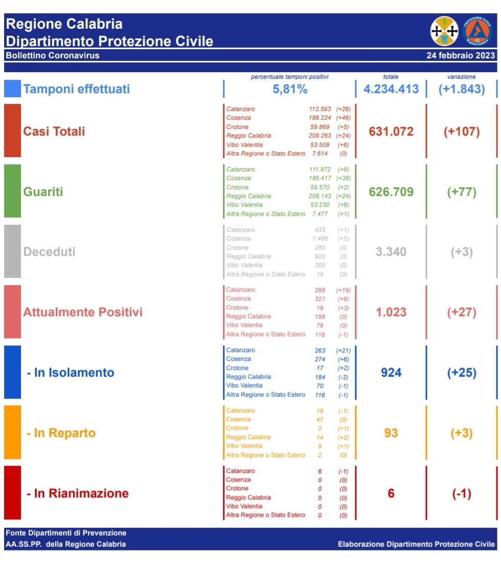 CATANZARO Sono 107 i nuovi casi di Covid registrati nelle ultime 24 ore in Calabria, per un tasso di positività del 5,81%. Il dato emerge dal bollettino della Regione, che nelle ultime 24 ore registra 3 decessi e 77 guariti. Lieve aumento dei ricoveri in reparto (+3, in totale sono 93), e diminuzione dei ricoveri in terapia intensiva (-1, in totale sono 6).
