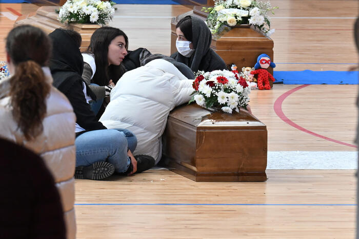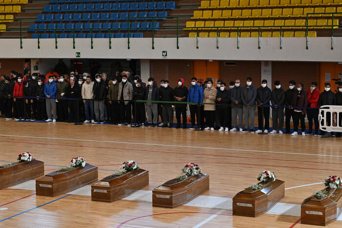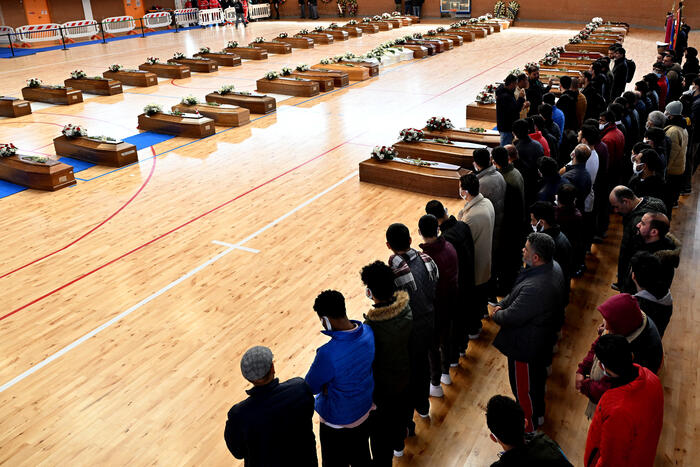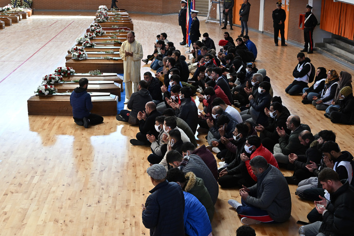 Scene di dolore davanti alle bare delle vittime del naufragio. Preghiera interreligiosa dell’imam di Cutro, Achik, e del vescovo di Crotone, Panzetta
