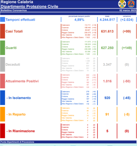 CATANZARO Le persone risultate positive al Coronavirus sono 631613 (+99) rispetto a ieri. Questi sono i dati giornalieri relativi all’epidemia da Covid-19 comunicati dai Dipartimenti di Prevenzione delle AA.SS.PP. della Regione Calabria. In Calabria, ad oggi, il totale dei tamponi eseguiti sono stati 4244817 (+2.024).