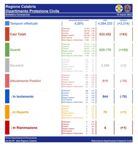 CATANZARO Le persone risultate positive al Coronavirus sono 632.452 (+93) rispetto a ieri.