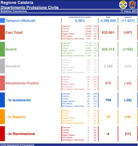 Catanzaro: CASI ATTIVI 430 (28 in reparto, 3 in terapia intensiva, 399 in isolamento domiciliare); CASI CHIUSI 112554 (112118 guariti, 436 deceduti). Cosenza: CASI ATTIVI 179 (27 in reparto, 0 in terapia intensiva, 152 in isolamento domiciliare); CASI CHIUSI 188652 (187156 guariti, 1496 deceduti). Crotone: CASI ATTIVI 25 (10 in reparto, 0 in terapia intensiva, 15 in isolamento domiciliare); CASI CHIUSI 59963 (59681 guariti, 282 deceduti). Reggio Calabria: CASI ATTIVI 91 (7 in reparto, 1 in terapia intensiva, 83 in isolamento domiciliare); CASI CHIUSI 209476 (208550 guariti, 926 deceduti). Vibo Valentia: CASI ATTIVI 37 (2 in reparto, 0 in terapia intensiva, 35 in isolamento domiciliare); CASI CHIUSI 53613 (53412 guariti, 201 deceduti).